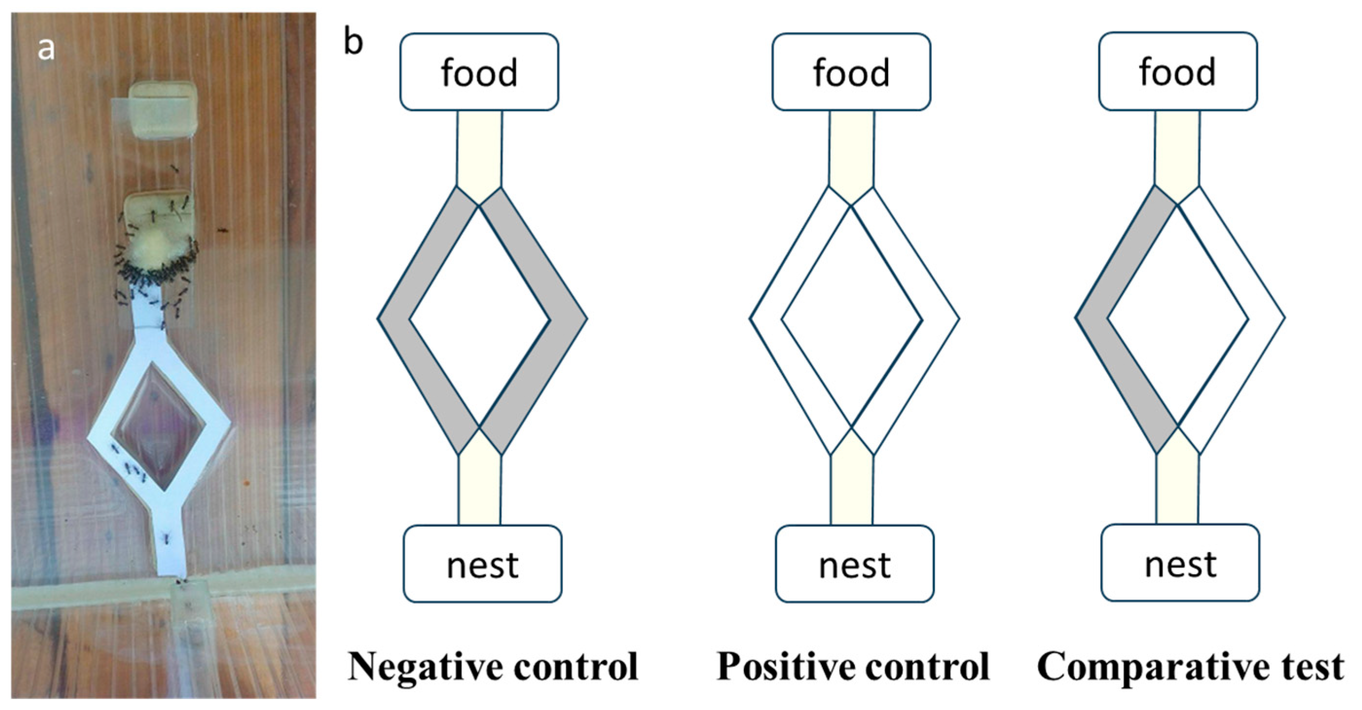 - Czaczkes, T.J.; Grüter, C.; Ellis, L.; Wood, E.; Ratnieks, F.L.W. Ant foraging on complex trails: Route learning and the role of trail pheromones in Lasius niger. J. Exp. Biol. 2012, 216, 188–197. [Google Scholar] [CrossRef]