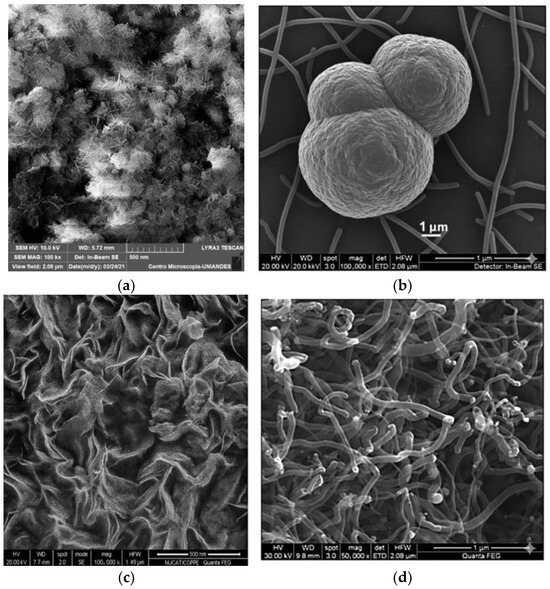 The NiEG material consists of unsupported NiO (JCPDS 04-0850). Consequently, its low reported “NiO content” from X-ray fluorescence (XRF) analysis reflects the stoichiometry of the pure nickel oxide phase and any associated surface species, rather than a dilution effect from a support material. The morphology of both catalysts was examined by scanning electron microscopy (SEM). Figure 2 presents SEM images of the supported (25NiZ) and unsupported (NiEG) catalysts, showing nanosphere and nanoflower arrangements, respectively, both before Figure 2a,c and after reaction Figure 2b,d at 593 K [29,30].