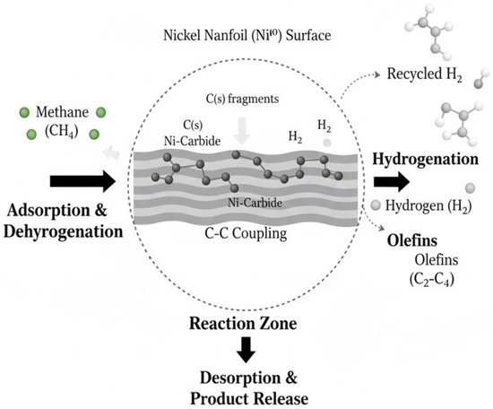 Therefore, the unsupported NiO nanoflower (NiEG) catalyst demonstrates high suitability for the direct production of higher hydrocarbons and olefins from methane. This efficacy is directly linked to its unique morphology (Figure 3b), which maximizes the exposure of active sites, thereby facilitating the initial C-H bond cleavage and subsequent hydrogenation of the resulting surface intermediates. Based on the experimental evidence, we propose a reaction pathway for methane conversion over the NiEG catalyst, as illustrated in Figure 5.