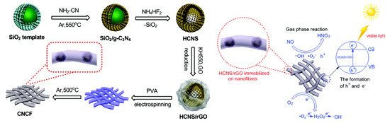 Synthesis process of HCNS/rGO/CNCF and the photocatalytic NO removal mechanism [30]. Copyright 2014, Royal Society of Chemistry.
