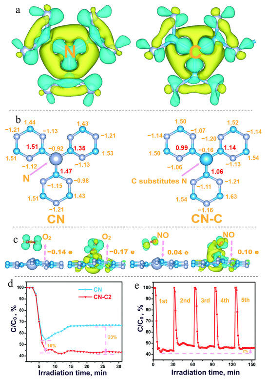 Charge difference distribution (a) and carried electrons (b) of pristine g-C3N4 and C self-doped g-C3N4, charge difference distribution of optimized O2/NO adsorption on pristine g-C3N4 and C self-doped g-C3N4 (c); the photocatalytic NOx removal performance of pristine g-C3N4 and C self-doped g-C3N4 (d); and cycling stability of C self-doped g-C3N4 (e) [41]. Copyright 2018, Royal Society of Chemistry.