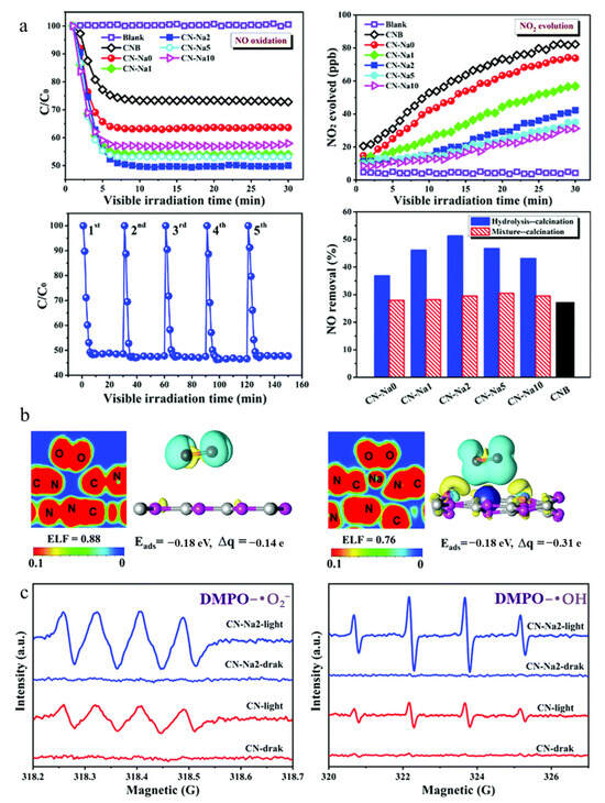 Metal-doped g-C3N4 has been widely explored to enhance photocatalytic activity and selectivity. Single-atom sodium (Na) doping increases the light absorption rate and adsorption capacity of g-C3N4, facilitates carrier separation, and significantly elevates the NO removal efficiency from 36.8% to 52.5%, while simultaneously suppressing the formation of toxic NO2 by-products (Figure 4) [45]. Electron localization function (ELF) analysis confirms that Na atoms occupy carbon sites within g-C3N4, forming N-Na-N bonds. Charge difference distribution analysis indicates electron transfer from Na to adjacent nitrogen atoms, activating N-C3 motifs and generating an internal electric field between layers. This enhances lateral charge transfer and improves photocatalytic performance. It is generally accepted that Na atoms embed within the π-conjugated plane of g-C3N4. In contrast, larger alkali metal atoms such as potassium (K) [46,47] and cesium/rubidium (Cs/Rb) [48] tend to intercalate between g-C3N4 layers. This intercalation forms charge transfer bridges and channels, reducing electron localization and effectively separating charge carriers.