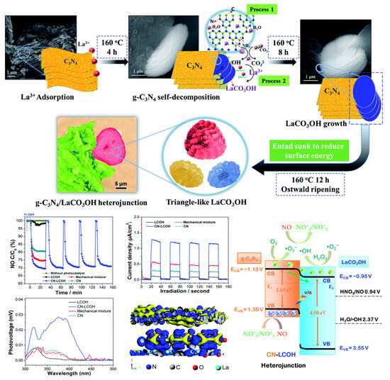 - Wang, Z.; Huang, Y.; Chen, L.; Chen, M.; Cao, J.; Ho, W.; Lee, S.C. In situ g-C3N4 self-sacrificial synthesis of a g-C3N4/LaCO3OH heterostructure with strong interfacial charge transfer and separation for photocatalytic NO removal. J. Mater. Chem. A 2018, 6, 972–981. [Google Scholar] [CrossRef]