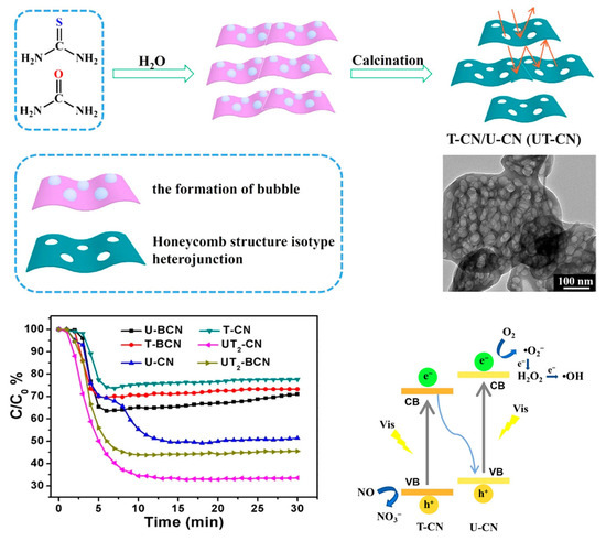 Schematic illustration of the fabrication of a honeycomb-like g-C3N4 heterojunction (T-CN/U-CN, UT-CN), visible-light photocatalytic activities of the g-C3N4 samples for removal of NO, and photocatalytic mechanism of NO removal by UT-CN samples under visible-light illumination [99]. Copyright 2018, Royal Society of Chemistry.