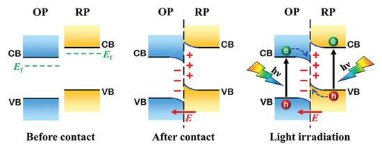 Yu’s research group [110] introduced a novel stepped (S-Scheme) heterojunction concept derived from the direct Z-Scheme heterojunction (Figure 9). The S-Scheme heterojunction comprises an oxidative photocatalyst (OP) and a reductive photocatalyst (RP). A fundamental requirement for the formation of a S-Scheme heterojunction is that both the conduction band position and Fermi level of RP must be higher than those of OP, with either RP or OP being capable of existing as n-type or p-type semiconductors. Upon contact between the two semiconductors, electrons will migrate from RP to OP at the interface due to the elevated Fermi level of RP, resulting in electron depletion in RP and consequently rendering it positively charged. In contrast, OP accepts these electrons and becomes negatively charged. This interaction leads to upward or downward band bending at the interface between RP and OP, establishing an internal electric field directed from RP towards OP. Under the combined influence of this internal electric field, Coulomb attraction, and band bending effects, photogenerated electrons are transferred from the conduction band (CB) of OP to the valence band (VB) of RP. Consequently, within this S-type photocatalytic system, electrons are retained in the CB of RP while holes accumulate in the VB of OP. This configuration demonstrates robust redox capabilities along with exceptional charge separation efficiency, thereby significantly enhancing photocatalytic performance [111].