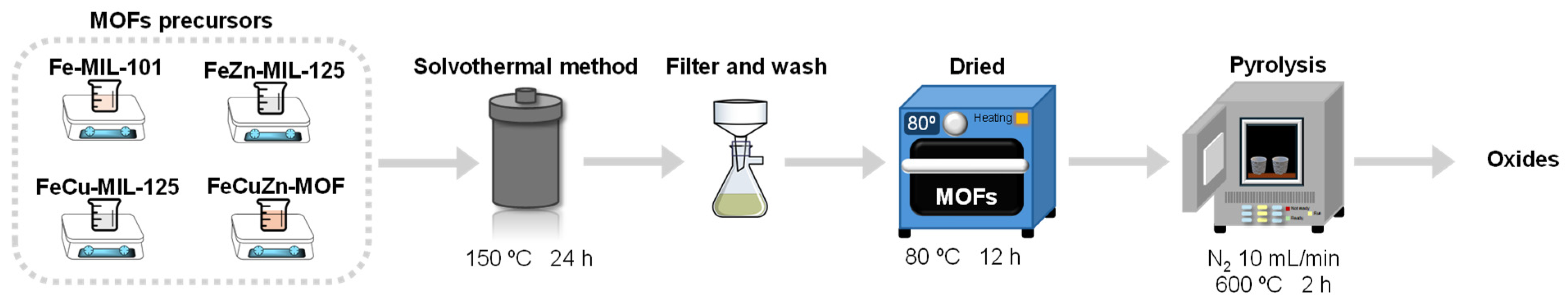 | FeCuZn-MIL-101 | FeCuZn-MOF | CuO-ZnO-Fe2O3@C | FeCuZnO |