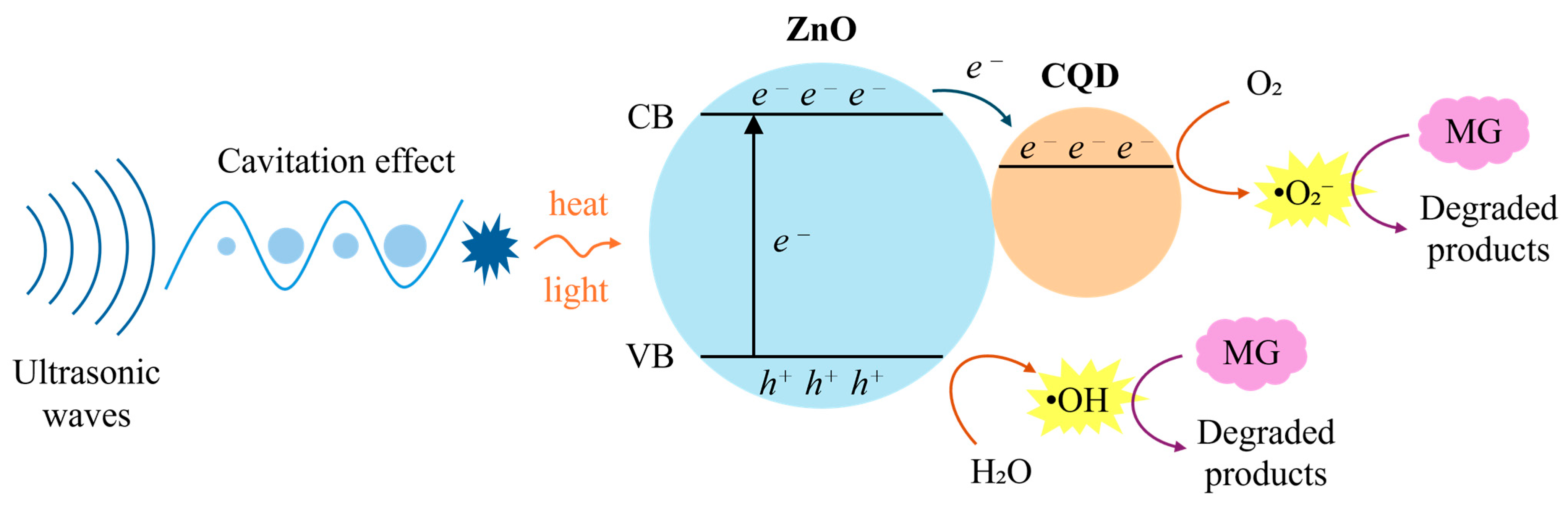 - Toma, E.E.; Stoian, G.; Cojocaru, B.; Parvulescu, V.I.; Coman, S.M. ZnO/CQDs Nanocomposites for Visible Light Photodegradation of Organic Pollutants. Catalysts 2022, 12, 952. [Google Scholar] [CrossRef]