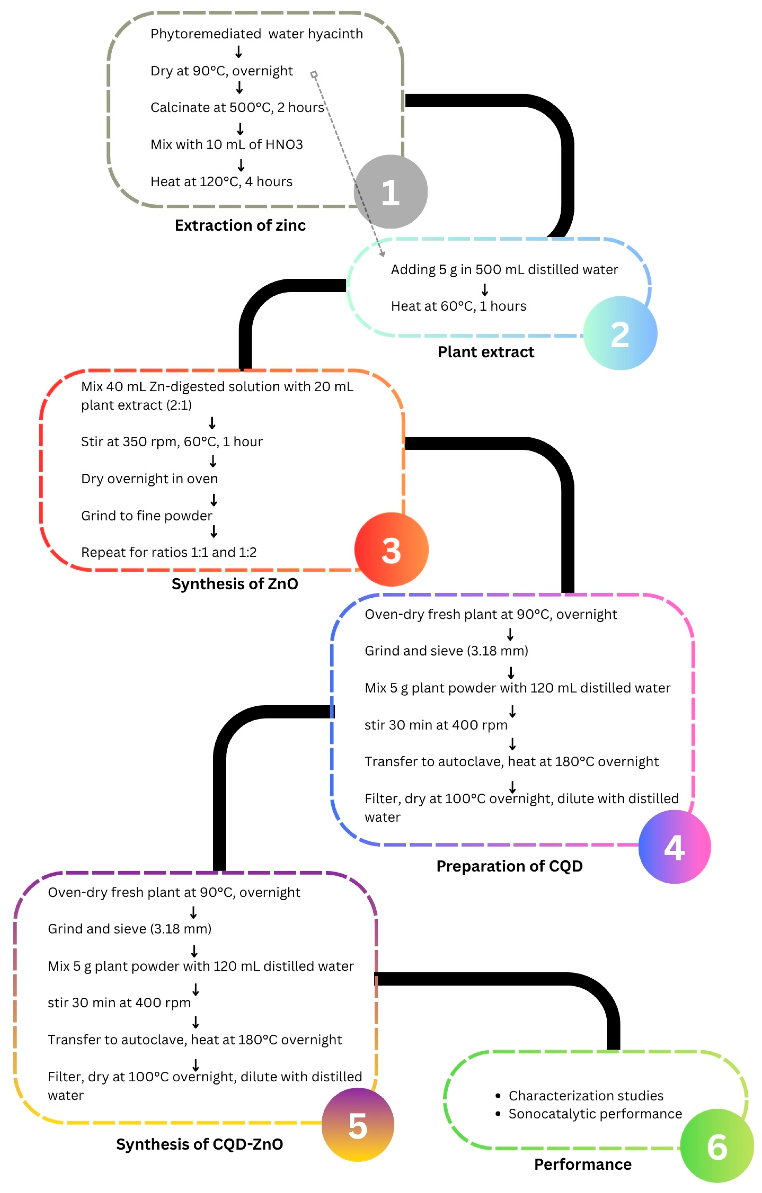 Pang, Y.L.; Tan, H.W.; Lim, S.; Tai, J.W.; Chong, W.C.; Shuit, S.H. Sustainable Synthesis of Phytoremediated Eichhornia Crassipes-Derived Carbon Quantum Dot Supported on Zinc Oxide (CQD-ZnO): Characterisation and Sonocatalytic Activity. Catalysts 2025, 15, 1051. https://doi.org/10.3390/catal15111051