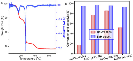 In this work, a series of Au-based catalysts were synthesized. Layered double hydroxides (Co3AlOx-LDH) were prepared as the precursor of the supporting materials. Before the modulation of the catalyst, the synthesis details were studied and optimized in terms of the thermal treatment and deposition procedure. After the deposition of gold nanoparticles and thermal calcination, Co3AlOx is likely to be formed depending the detailed temperature during thermal treatment, which has an important influence on the dispersion of metal species and the Au–support interaction. Herein, the TG/DTG curves of the Au/Co3Al-LDH precursor is preliminarily analyzed in Figure 1 to understand the possible phase transition during calcination. Several continuous steps of weight loss are observed. The first step at 120–185 °C is caused by the release of adsorbed water and the water molecules between the hydrotalcite layers, which gradually decomposes under increasing temperature. Intensified weight loss at 230–285 °C can be ascribed to the decomposition of carbonate and transformation of hydrotalcite in the catalyst precursors [20,21]. A subsequent weight loss happens at even higher temperature until 450 °C, which should be correlated with the decomposition of PVA bonding with the Au nanoparticles [22]. The TG/DTG curves suggest that most of the chemical composition can be decomposed at 300 °C. During this process, hydrotalcite is gradually transformed into spinel and the Au nanoparticles are stabilized and exposed on surface. The catalysts were designed for the selective hydrogenation of benzyl alcohol. The schematic illustration of the reaction is shown in Scheme S2. Benzaldehyde is the target product and benzene, benzoic acid and toluene could be produced under unqualified catalyst system. A simple test by calcination of the Au/Co3Al-LDH precursor at different temperature also confirmed the superiority by thermal treating the sample at 300 °C in Figure 1b and Table S1 (supporting information). The catalytic performances by catalysts going through different pre-treatments suggest that one-pot calcination is necessary to make efficient gold catalysts (Figure S1). Herein, the calcination temperature is fixed at 300 °C for subsequent study.