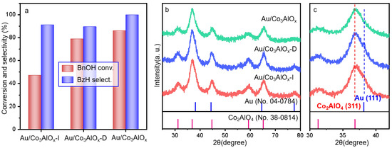 The in situ reduction immobilization was used to synthesize the supported Au nanoparticles (Au NPs) as we previously reported [19]. Two additional references prepared by traditional impregnation and deposition-precipitation method are also tested for comparison in Figure 2a. Comparing with the Au/Co3AlOx by in situ reduction immobilization, the Au/Co3AlOx-I displays poor BnOH conversion of only 48.5% with 90.3% selectivity to BzH. The Au/Co3AlOx-D shows mean activity with 86.1% BnOH conversion and 99.9% BzH selectivity. The Au/Co3AlOx by in-situ reduction immobilization method displays greatly improved BnOH conversion of 86.1% with 89.3% selectivity of BzH. The XRD patterns in Figure 2b,c suggest the similar crystal phases by different synthesis methods. Characteristic peaks of the Co2AlO4 spinel phase with 2θ of 31.2°, 36.8°, 44.8°, 59.3° and 65.2° [23], corresponding to the Co2AlO4 (220), (311), (400), (511), (440) crystal planes. However, there are not any clear diffraction peaks of Au crystal phase, probably due to the overlapping or covering of the Co2AlO4 (311) with the Au (111) plane. The magnified XRD patterns in Figure 2c display more details that a shoulder peak becomes apparent in both the Au/Co3AlOx-I and Au/Co3AlOx-D, which should be ascribed to the overlapping Au (111) plane at 38.2°. The absence of shoulder peak in Au/Co3AlOx by reduction immobilization evidences the smaller particles with fine distribution than the other samples, which should be one of the reasons for the better performance of BnOH oxidation. According to the preliminary discussion of the catalysts with optimized synthesis method, a series of Au/ConAlOx catalysts with different Co/Al ratio are designed using the in-situ reduction immobilization method.