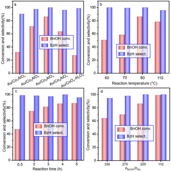 The effect of reaction temperature and reaction time are further optimized using the Au/Co3AlOx as a typical catalyst in Figure 3b–d and Table S2. At low temperature, the conversion of BnOH is only 50.3% at 60 °C, with a high BnOH selectivity of 99.9%. As the reaction temperature increases, the BnOH conversion exhibits an increasing trend from 60 to 80 °C, while the BzH selectivity remains nearly 100%. Further increasing the temperature, both the conversion of BnOH and the selectivity of BzH decrease, probably due to the by-products generated by condensation between reactants. Figure 3c reveals the influence of reaction time on the catalytic performances. The BnOH steadily increases with the prolonged reaction time and reaches the saturation at 3–4 h. The catalyst dosage also impacts the BnOH conversion in terms of the molar ratio between BnOH and catalyst (Figure 3d). The BnOH conversion reaches 64.5% under nBnOH/nAu of 330, which steadily increases with the nBnOH/nAu ratio. The BnOH conversion and the BzH selectivity reach 98.5% and 99.1% under nBnOH/nAu of 110.