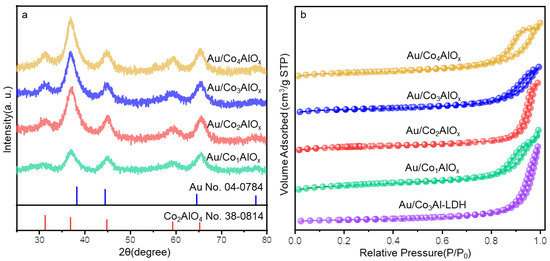 The morphology of Au/Co1AlOx and Au/Co3AlOx is displayed in Figure S3. Cloud-like surfaces can be observed in these samples. Compared with Au/Co3AlOx, the Au/Co1AlOx with lower Co/Al ratio is more heterogeneous with surface roughness. The specific surface area and pore size distribution of catalysts are measured by the N2 adsorption-desorption curves in Figures 4b and S4. All the tested samples exhibit typical IV isotherms with a pronounced H3-type hysteresis loop [24,25]. The pore size distribution calculated using the Barret-Joyner-Halenda (BJH) model is in the range of 2–14 nm as mesoporous adsorbent materials. The specific surface area of Au/Co3Al-LDH precursor before calcination is only 53 m2/g with the average pore size of 14.0 nm (Table S4). After calcination, the specific surface area of the Au/ConAlOx increases to 86–106 m2/g with the reduced Co/Al ratio. The specific surface area and pore volume of Au/Co3AlOx and Au/Co4AlOx reach the maximum of 102–106 m2/g and 0.38–0.39 cm3/g. The porous structure may further influence the distribution of Au NPs and the interacting synergy between Au and the supporting material [26].
