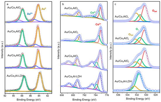 The surface chemical states of metal and oxygen species are further explored by the XPS spectra in Figure 6. The Au 4f XPS spectra of the Au/Co3Al-LDH precursor without calcination displays a pair of deconvolution peaks at 83.9 eV and 87.5 eV, which are ascribed to the presence of surface Au0 species. It is a direct result of the formation of Au NPs by in situ reduction during synthesis, which are deposited on the Co3Al-LDH without great interaction before calcination. After calcination, a pair of additional characteristic peaks at 84.7 and 88.3 eV are observed, related with the Auδ+ (0 < δ < 1) species in oxidative states. Reports confirmed such Auδ+ species as direct evidence for the strong interaction between Au and metal oxide by Au atoms bonding with the oxygen species on support [27,28]. Santra et al. [29] also suggested that the creation of Auδ+-V0-Ce3+ sites was induced by the increasing O vacancy on ceria and was responsible for the better activity of Au catalysts. Surprisingly, obvious peak shifts of the Au0 species towards higher B.E. value are detected in the calcined Au/ConAlOx catalysts with the increasing Co/Al ratio, indicating the electrons escaping from the surface of Au NPs. Quantitative analysis demonstrates that the Au/Co3AlOx and Au/Co4AlOx catalysts possesses the much-higher Auδ+ content of 39.4% and 31.5% (Table S5), respectively. Liu et al. [30] reported that the Au roasted in air easily reacted with the lattice oxygen of support and was conducive to the selective oxidation of many primary alcohols. Previous research also suggested the formation of Auδ+ species on the adsorption and activation of reactants during oxidation reactions. Oxygen adsorption and dissociation may also facilitated on these small Au nanoparticles, where defect sites are predominantly formed with better modulated electronic structure, as depicted by TEM images and XPS spectra [31].
