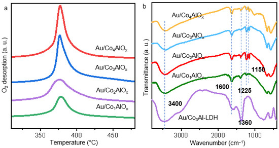(a) O2-TPD profiles and (b) FT-IR spectra by Au/Co3Al-LDH and different Au/ConAlOx catalysts.