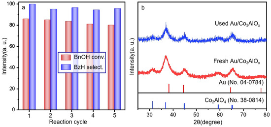 (a) Stability test by Au/Co3AlOx and (b) the XRD patterns of the fresh and used Au/Co3AlOx after reaction. Reaction conditions: Oxygen flow rate at atmospheric pressure is 20 mL/min, atmospheric pressure, 80 °C, 4 h, nBnOH/nAu = 220.
