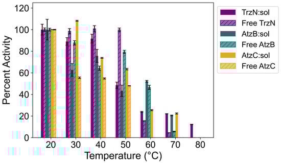 The catalytic activity of each enzyme, both in their free soluble and sol–gel encapsulated forms, was examined at various temperatures (Figure 4). Each of the biomaterials was incubated in a water bath for 30 min at increasing temperatures in 50 mM Tris HCl, pH 7.5. Afterward, the biomaterials were allowed to cool and tested for activity at 25 °C. Encapsulation generally offered increased thermostability after exposure to temperatures greater than 50 to 60 °C. After exposure to 70 °C, soluble TrzN retained 4.5 ± 0.1% of its original activity compared to 22.1 ± 0.1% for the TrzN:sol, resulting in p = 1.7 × 10−3 and thus indicating significant thermal protection from encapsulation. Similar results were observed for AtzB, where the free enzyme retained 5.6 ± 0.3% of its activity compared to the 20.5 ± 0.3% retained by the AtzB:sol biomaterial after incubation at 70 °C. Significant protein precipitation and no activity were observed for AtzC after incubation at temperatures above 50 °C. However, AtzC:sol retained 22.3 ± 0.5% of its original activity after incubation at 70 °C, indicating that encapsulation significantly increased thermostability. In general, the thermostability of all three proteins increased at high temperatures when encapsulated in a sol–gel.