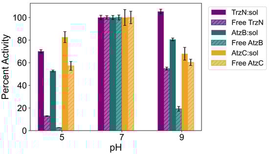 To test if encapsulation improved the stability of TrzN, AtzB, and AtzC at non-physiological pH values, the activity of the free and encapsulated enzymes was examined at pH 5 and 9. The activity of each sample was compared to a control at pH 7, and the percentage of retained activity was calculated. Overall, encapsulated TrzN, AtzB, and AtzC retained significantly higher activity levels at pH 5 and 9 compared to the free enzyme (Figure 5). Free TrzN only retained 12.8 ± 0.6% and 55 ± 1% of activity at pH of 5 and 9, respectively. This is in contrast to TrzN:sol, which retained 70 ± 1% and 102 ± 3% under the same conditions. A one-sided, paired t-test comparing activity retained by free enzyme and encapsulated enzyme shows a p-value of 4.4 × 10−3 and 4.9 × 10−4, respectively, indicating that the observed protection by the material is statistically significant. This is consistent with previous tests on TrzN encapsulation []. Free AtzB was virtually inactive at pH 5, retaining only 2 ± 1% of its activity, in contrast to AtzB:sol, which retained 53 ± 1% under the same conditions. Statistical analyses result in a p-value of 2.7 × 10−3, indicating that the encapsulation significantly protects AtzB under these conditions. In basic conditions (pH 9), free and encapsulated AtzC retained 19 ± 2% and 81 ± 3% in activity, respectively, resulting in p = 5.1 × 10−2. At pH 5, soluble AtzC retained 57 ± 4% of activity when observed at pH 7, while AtzC:sol retained 83 ± 4%. At pH 9, the free and encapsulated AtzC enzyme retained roughly the same activity: 60 ± 3% and 65 ± 5%, respectively. Overall, these results show that encapsulation within a sol–gel matrix protects all three enzymes at both acidic and basic pH values.