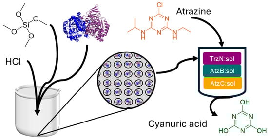 In comparison to whole-cell reactions, isolated enzymes have fewer side reactions, do not risk altering the microbiota of the environment, and do not require nutrients or aeration [20,21,22]. However, isolated enzymes are susceptible to environmental degradation by high temperatures, proteases, and other factors [21]. Encapsulation was shown to protect enzymes from such environmental degradation [20,22]. TrzN has been previously encapsulated within silica glasses derived through the sol–gel process, which resulted in a biomaterial that was more robust compared to wild-type (WT) TrzN [23]. Reported herein, both AtzB and AtzC were encapsulated in a tetramethyl orthosilicate (TMOS)-based sol–gel, the best matrix for TrzN biomaterials [23]. The stability of both AtzB and AtzC, like TrzN, was enhanced when encapsulated within a sol–gel matrix under a variety of conditions, including long-term storage, non-physiological pH, increased temperature, and in the presence of proteases such as trypsin. A combination of all three biomaterials, TrzN:sol, AtzB:sol, and AtzC:sol, into an enzyme cascade where they are in sequence or combined, allowed for the efficient degradation of atrazine to cyanuric acid, the first non-toxic compound in the atrazine biodegradation pathway.