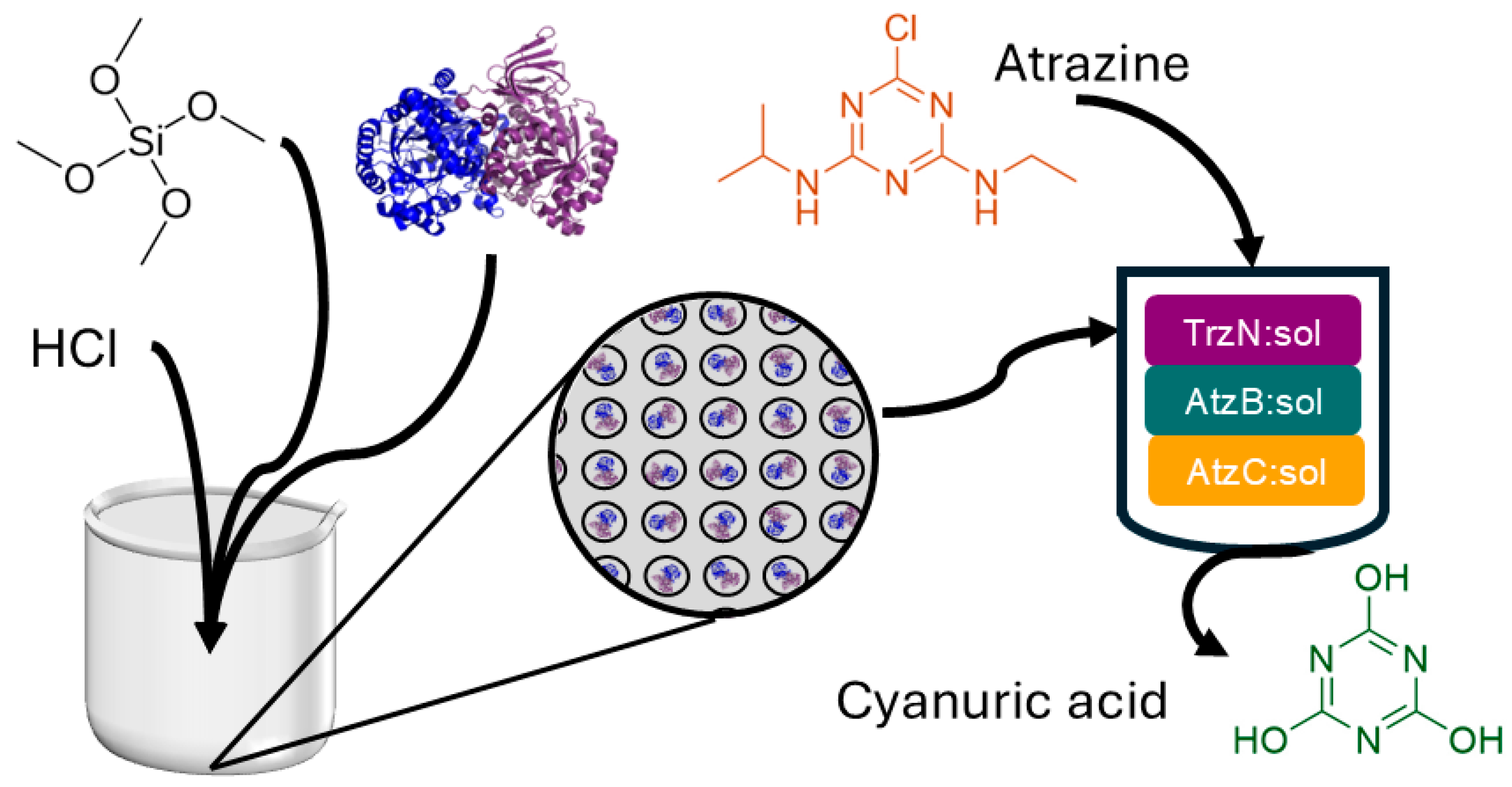 Atrazine (2-chloro-4-ethylamino-6-isopropylamino-s-triazine CAS: 1912-24-9) is a widely used herbicide that has been connected to a variety of negative human health and environmental effects. Various bacterial strains utilize a six-step enzyme cascade to fully degrade atrazine. The third step in this pathway, N-isopropylammelide aminohydrolase (AtzC), produces the first non-toxic intermediate, cyanuric acid. As such, AtzC, paired with enzymes catalyzing the first two steps in this pathway, triazine hydrolase (TrzN) and hydroxyatrazine (2-(N-ethylamino)-4-hydroxy-6-(N-isopropylamino)-1,3,5-triazine) N-ethylaminohydrolase (AtzB), can effectively degrade atrazine. All three of these enzymes were successfully encapsulated in tetramethyl orthosilicate (TMOS) gels using the sol–gel method, producing active biomaterials. These materials showed increased protection against proteolytic digestion by the endopeptidase trypsin, as well as increased thermal and pH stability when compared to their non-encapsulated counterparts. AtzB:sol and AtzC:sol also showed increased stability over time compared to soluble enzyme. A combination of all three biomaterials, TrzN:sol, AtzB:sol, and AtzC:sol, was shown to be effective at fully degrading 50 µM atrazine to cyanuric acid in just over an hour and a half, thus establishing a potential bioremediation enzyme cascade for atrazine.
