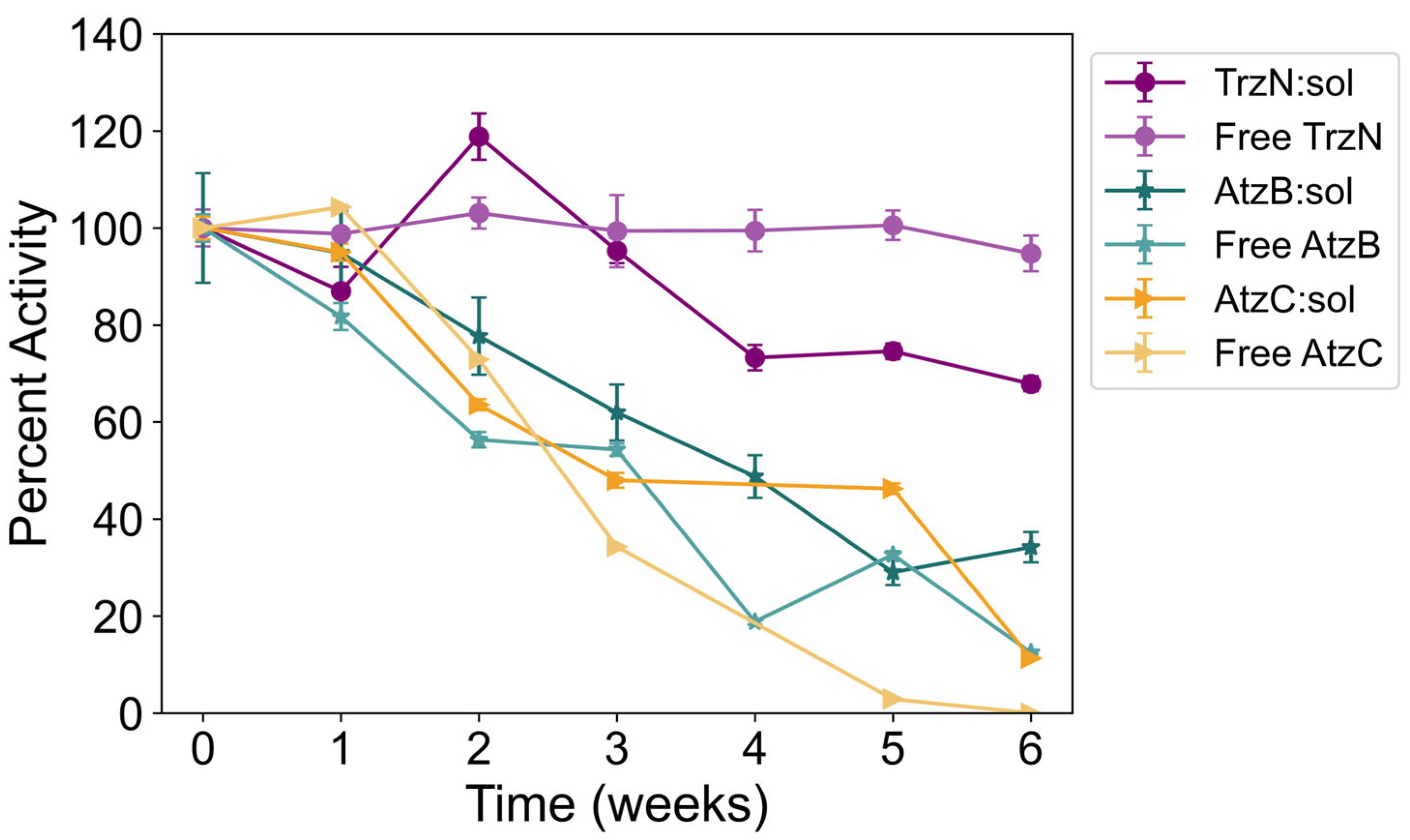 Soluble and encapsulated enzymes were stored for a period of six weeks at 4 °C. Each week, activity was tested and compared to the initial activity on week 0 (Figure 6). The storage buffer was tested for enzyme loss using a Bradford assay. After five weeks, soluble AtzC had no detectable activity compared to the AtzC:sol, which retained 46 ± 1% of its original activity and 11 ± 1% after six weeks. Unencapsulated AtzB performed slightly better, retaining 12 ± 4% of its initial activity after six weeks compared to AtzB:sol, which retained 34 ± 3% of its original activity after six weeks. A paired t-test revealed p = 5.2 × 10−2, which is just above α = 0.05; thus, encapsulation protects less stable proteins from degradation over time when stored at 4 °C. Soluble TrzN, however, was shown to remain active over the entire course of the study, retaining 95 ± 4% of its activity at the end of the six weeks. TrzN:sol retained 68 ± 2%, consistent with previous studies on TrzN [23]. This loss of activity can be attributed to protein loss observed in weeks three and four, rather than enzyme degradation.