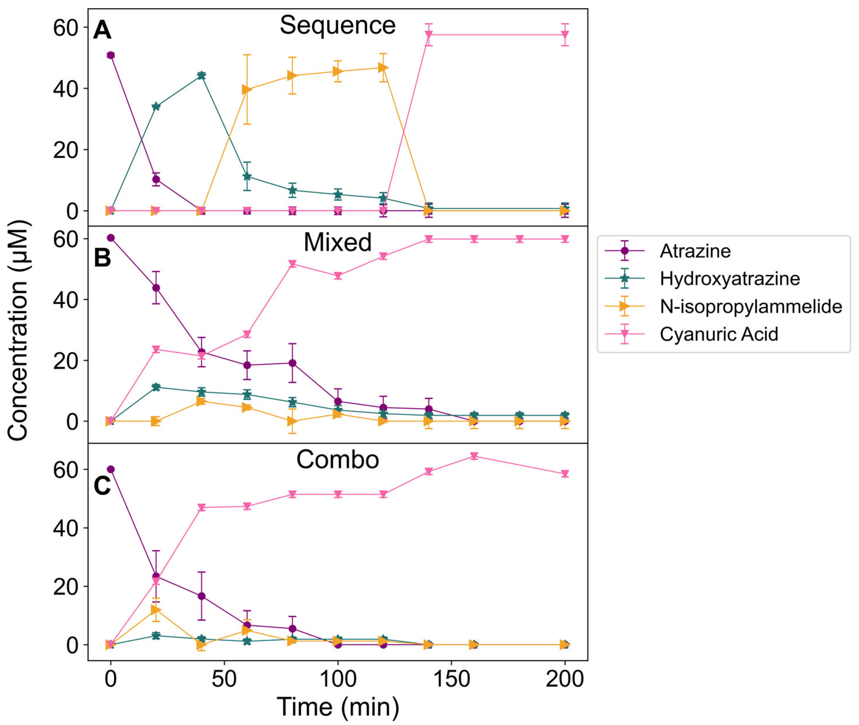 Degradation of atrazine to cyanuric acid by a three-enzyme cascade: Three different versions of a TrzN:sol, AtzB:sol, and AtzC:sol enzyme cascade were tested: sequential, mixed gels, and combo gels. With sequential gels, 3 mL of 50 µM atrazine in 50 mM HEPES at pH 7 was added to 100 µL 2 mg/mL of TrzN:sol. After the reaction was completed, the reaction mixture was decanted to 100 µL of 2 mg/mL of AtzB:sol, and again, the reaction was allowed to proceed to completion. Finally, the reaction mixture was decanted to 100 µL of 2 mg/mL of AtzC:sol, and the reaction was allowed to proceed to completion.