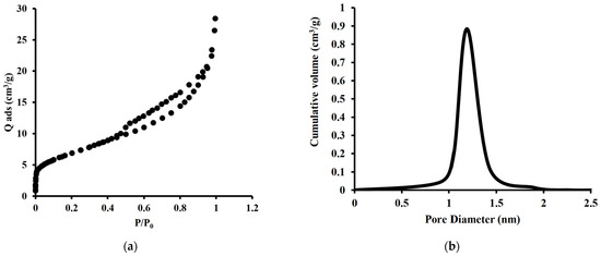 As demonstrated in Figure 2a, the specific surface area, micropore volume, and total pore volume were found to be 19 m2 g−1, 6 m3 g−1, and 5 cm3 g−1, respectively, based on the multipoint adsorption isotherm of N2. Subsequently, the BJH Adsorption Pore Distribution method was employed, revealing an average pore diameter of 1.19 nm (see Figure 2b). All of the above demonstrate that the adsorption phenomenon is minimal in the pollutant elimination process.