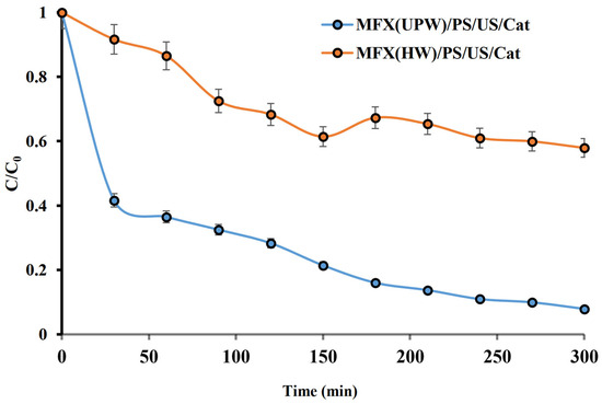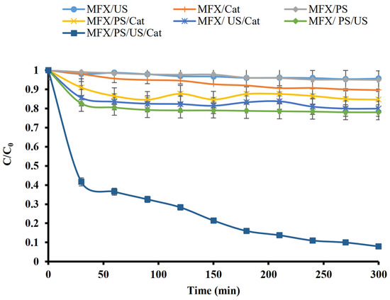 Evolution of MFX degradation in different systems. Experimental conditions: [MFX] = 60 µmol L−1, [Laterite] = 0.75 g L−1, [PS] = 60 µmol L−1, pH = 7 ± 0.2, T = 25 ± 2 °C, Ultrasound power = 240 W, Ultrasound frequency = 24 KHz, Reaction time = 300 min.