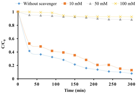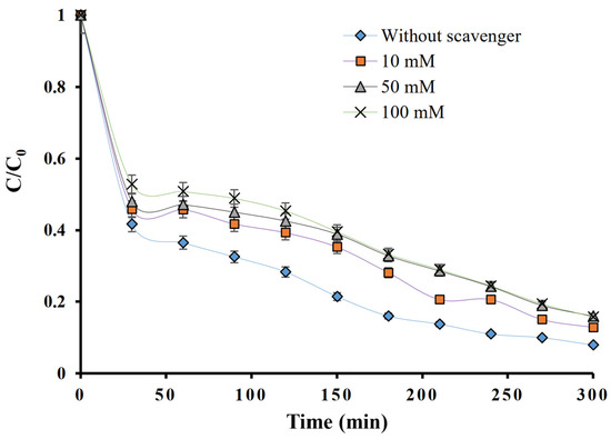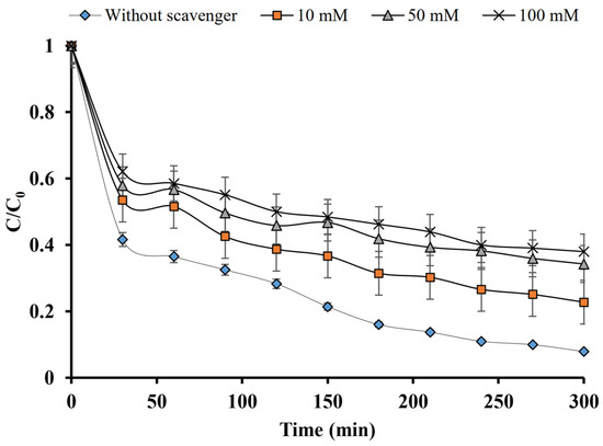 As illustrated in Figure 5, the impact of tert-Butanol (t-BuOH) concentration on the degradation kinetics of MFX is evident. The results showed that the degradation rate was 92 ± 2% without scavengers after 300 min, while the inhibition effects at 10, 50, and 100 mM of t-BuOH were 15%, 26%, and 30 ± 2%, respectively, resulting in a reduced degradation rate of 62 ± 2%. The mineralization rate (i.e., [TOC]/[TOC]0) also decreased from 56 ± 2% to 40 ± 2% after 300 min. This reduction in degradation efficiency was attributed to the scavenging of hydroxyl radicals (OH•) by t-BuOH [16,30]. Despite the high reaction rate between OH• and MFX, t-BuOH exhibits a stronger reactivity with hydroxyl radicals (OH•) (i.e., kt-BuOH/OH• = (3.8–7.6) × 108 M−1 S−1) [23] and a weaker reactivity with sulfate radicals (SO4•−) (i.e., kt-BuOH/SO4•− = (4–9.1) × 105 M−1 S−1) [32]. However, t-BuOH does not react with O2•− [29]. The best concentration of t-BuOH needed to stop the hydroxyl radicals was found to be 100 mM.