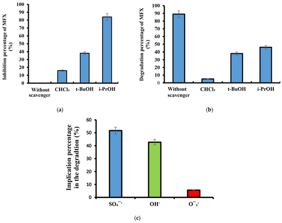 Figure 7 illustrates the degradation and inhibition percentages of MFX as a function of various scavengers, as well as the relative contribution of individual radicals to the overall degradation. The overall degradation efficiency was 89%, while the total elimination was 92%, indicating approximately 3% of MFX removal was due to adsorption (sorption). After the addition of i-PrOH, only 5% degradation of MFX was observed, while 84% was inhibited. In the case of t-BuOH, 51% of degradation and 38% of inhibition were recorded. Similarly, in the presence of Chl, 73% degradation and 16% inhibition were observed (Figure 7a,b). Based on these results, the relative degradation percentages assigned to the main reactive species O2•−, OH•, and SO4•− were 5%, 38%, and 46%, respectively. These contributions were further refined to 5.62%, 42.7%, and 51.69%, respectively, indicating their quantitative roles in overall MFX degradation (89%) (see Figure 7c) [16].