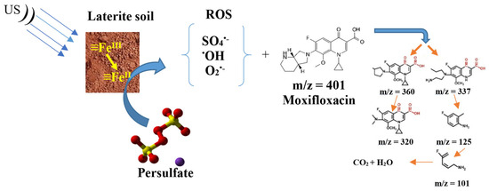 Fluoroquinolones are a major issue in aquatic ecosystems due to their persistence, potential to induce antibiotic resistance, and inability to be effectively removed using conventional treatment methods. Several advanced oxidation processes have been studied for their degradation; however, there is still a lack of knowledge about their degradation mechanisms and the precise roles played by reactive species. In this context, the study investigated the heterogeneous activation of persulfate (PS) to degrade fluoroquinolones (FQs), such as moxifloxacin (MFX), in iron-rich soil (Cat) under ultrasound irradiation (US). The analysis of the soil catalyst revealed the presence of quartz (35%), iron oxides (33%), and alumina (26%) as the predominant constituents of the sample. The mineral phase analysis indicated the presence of magnetite, hematite, and alumina. Then, the outcomes of the specific surface area, micropore volume, and total pore volume were determined to be 19 m2 g−1, 6 m3 g−1 and 9.10 m3 g−1, respectively. The MFX/PS/US/Cat system demonstrated 89% degradation and 56% mineralization after 300 min. However, the optimized concentrations of i-PrOH, t-BuOH, and CHCl3 were 50, 100, and 50 mM, respectively, in order to trap the radicals SO4•−, OH•, and O2•−. The study examined the individual contributions of SO4•−, OH•, and O2•− radicals to the overall process of MFX degradation. The results indicated that SO4•− was the primary radical, with a contribution of 52%, followed by OH• with 43%, and O2•− with 5%. Finally, the investigation revealed that laterite exhibited both good catalytic activity and reusability over several cycles. The development of this new process could stimulate the creation of cost-effective technology for water remediation through the effective removal of fluoroquinolones.