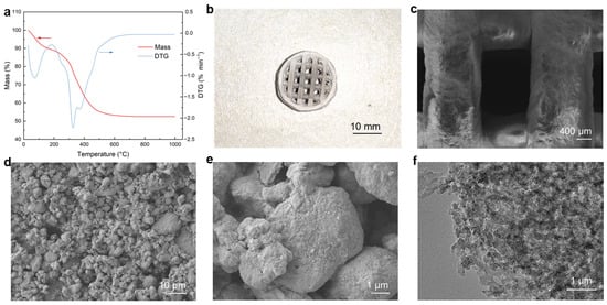 3D-printed catalyst after calcination. (a) Thermogravimetric (TG) curve of the 3D-printed precursor (red: mass loss; blue: differential thermogravimetry); (b) The 3D-printed structure after impregnation and calcination; (c–e) Scanning electron microscopy (SEM) images of the 3D-printed catalyst; (f) Transmission electron microscopy (TEM) images of the 3D-printed catalyst.