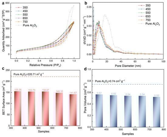 Moreover, the characteristic peaks corresponding to calcium-related crystalline phases in Figure 4a are weak, which can be attributed to the low content and uniform dispersion of calcium species on the support []. It should also be noted that the weak diffraction peaks observed at 22.3° and 32.9° suggest the presence of trace amounts of calcium aluminates (primarily Ca4Al6O13, PDF: 97-001-6177) [], the intensity of which increases with rising temperature. Additionally, the characteristic peaks at about 26° and 50° indicate the presence of a small amount of silicon dioxide (PDF: 97-003-9830) in the support, which originates from the bentonite.