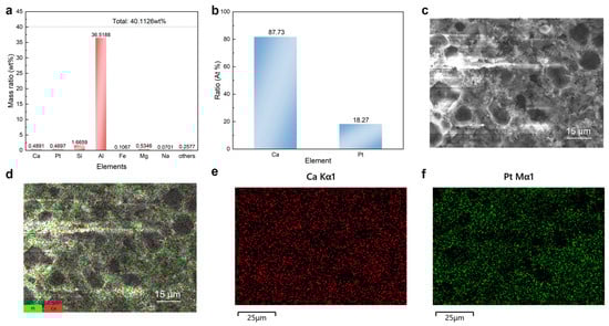 Figure 3a shows the elemental composition of the 550 sample as determined by inductively coupled plasma optical emission spectrometry (ICP-OES). The total weight fraction of metallic elements is approximately 40.11 wt%, with the remainder attributed to oxygen. The Pt and Ca weight fractions are approximately 0.47 wt% and 0.49 wt%, respectively, and the atomic ratio of Ca to Pt is about 5.08, indicating successful loading of the active species. The main elements, Si and Al, originate from pseudo-boehmite and bentonite. Fe, Mg, and Na are inherent components of bentonite, while other elements are trace impurities with mass fractions below 0.005 wt%. Since all catalysts use the same support, the influence of these additional elements on the catalytic performance is negligible. The atomic ratios of Ca and Pt were further analyzed by energy-dispersive X-ray spectroscopy (EDS) spot scanning and are presented in Figure 3b. The measured contents of Ca and Pt are approximately 87.7% and 18.27%, respectively, which are consistent with the ICP-OES results. To further investigate the distribution of the impregnated elements, elemental mapping was performed, as shown in Figure 3c–f. As illustrated in Figure 3d, calcium and platinum are uniformly distributed within the porous structure, and the particle size of the active species is significantly smaller than one micrometer, as confirmed by the images in Figure 3e,f.