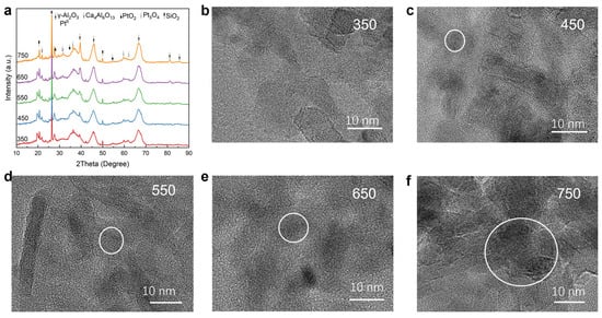 The TEM images of the catalyst calcined at temperatures ranging from 350 °C to 750 °C are presented in Figure 4b–f. Figure 4b shows that the dark points are uniformly distributed on the support, indicating a particle size much smaller than 1 nm. The particle sizes for the 450 °C, 550 °C, and 650 °C samples are approximately 4 nm, 5 nm, and 7 nm, respectively (Figure 4c–e). For the 550 °C and 650 °C samples, the particle boundaries are slightly connected. When a higher calcination temperature is applied, the Pt particle boundaries clearly coalesce, forming particles larger than 10 nm (Figure 4f), suggesting aggregation of platinum nanoparticles []. This is because the consumption of CaO by Al2O3 at high temperatures leads to a decrease in the amount and size of CaO particles (Figure 4a) [,], which weakens the confinement effect of CaO toward Pt particles [].