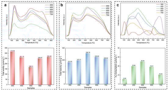 Programmed heating results under different atmospheric conditions. (a) NH3-TPD profiles and the corresponding total acidity; (b) CO2-TPD profiles and the corresponding total basicity; (c) H2-TPR profiles and the corresponding H2 consumption.