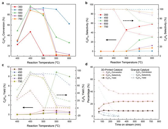The 3D-printing slurry was also manually shaped into granules with approximate dimensions of 3 mm × 1 mm (Figure S3) and prepared using the same protocol. A comparison of the dehydrogenation performance was conducted between the 3D-printed catalyst and the granular catalyst (Figure 6d). For the 3D-printed catalyst, the initial conversion decreases monotonically over the first 300 min, whereas the selectivity toward C6H10 increases. This phenomenon can be attributed to the in situ reduction and activation of the catalyst. After the reduction process, the catalyst exhibits stable conversion and selectivity toward cyclohexene. However, the granular catalysts exhibit significantly lower conversion, selectivity, and yield, all of which continuously decline until approaching zero (dashed line in Figure 6d). To maintain the same catalyst temperature (550 °C), the granular catalyst system requires a higher furnace temperature (approximately 590 °C), whereas the 3D-printed system achieves this at a lower furnace temperature (approximately 570 °C). Consequently, the lower conversion and selectivity can be attributed to the elevated temperature required to sustain the catalyst temperature []. Moreover, the higher furnace temperature accelerates catalyst deactivation, leading to a shorter operational lifetime, as illustrated in Figure 6d. The integrated channels within the catalyst also play a crucial role in facilitating product removal from the catalyst surface and enabling energy supply via mass flow [,], which warrants further investigation in future studies.