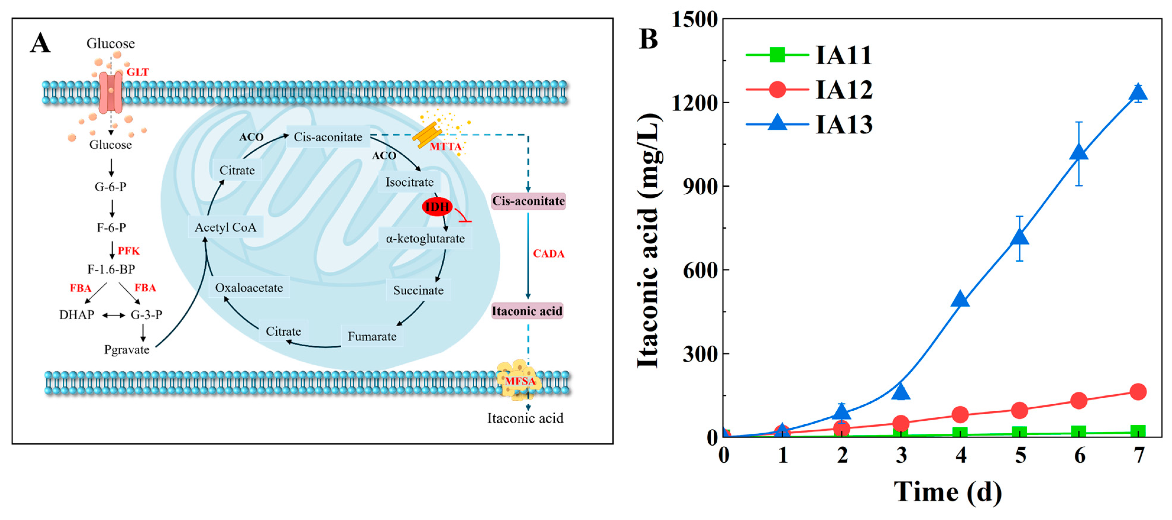 - Qi, H.; Du, Y.; Zhou, X.; Zheng, W.; Zhang, L.; Wen, J.; Liu, L. Engineering a new metabolic pathway for itaconate production in Pichia stipitis from xylose. Biochem. Eng. J. 2017, 126, 101–108. [Google Scholar] [CrossRef]