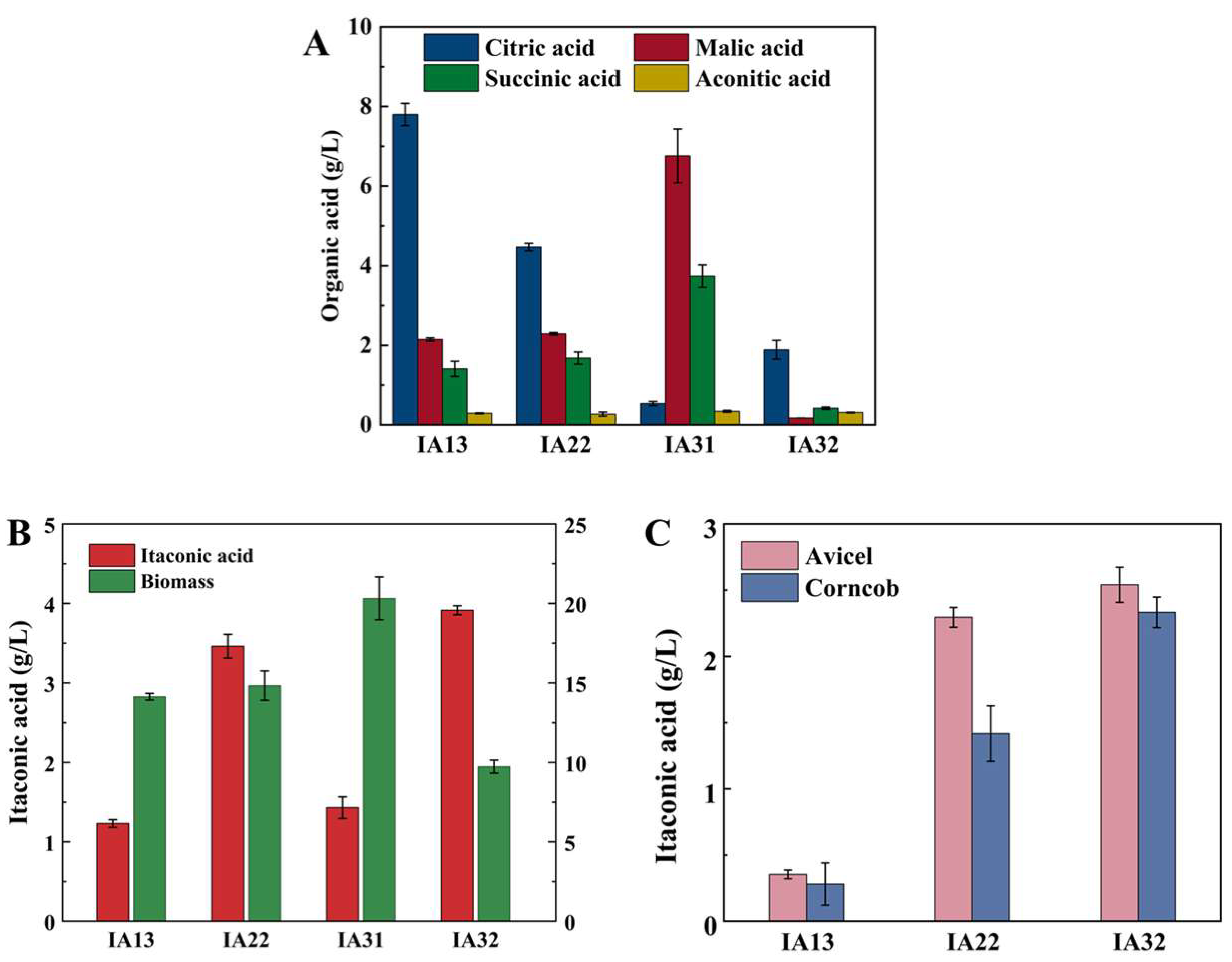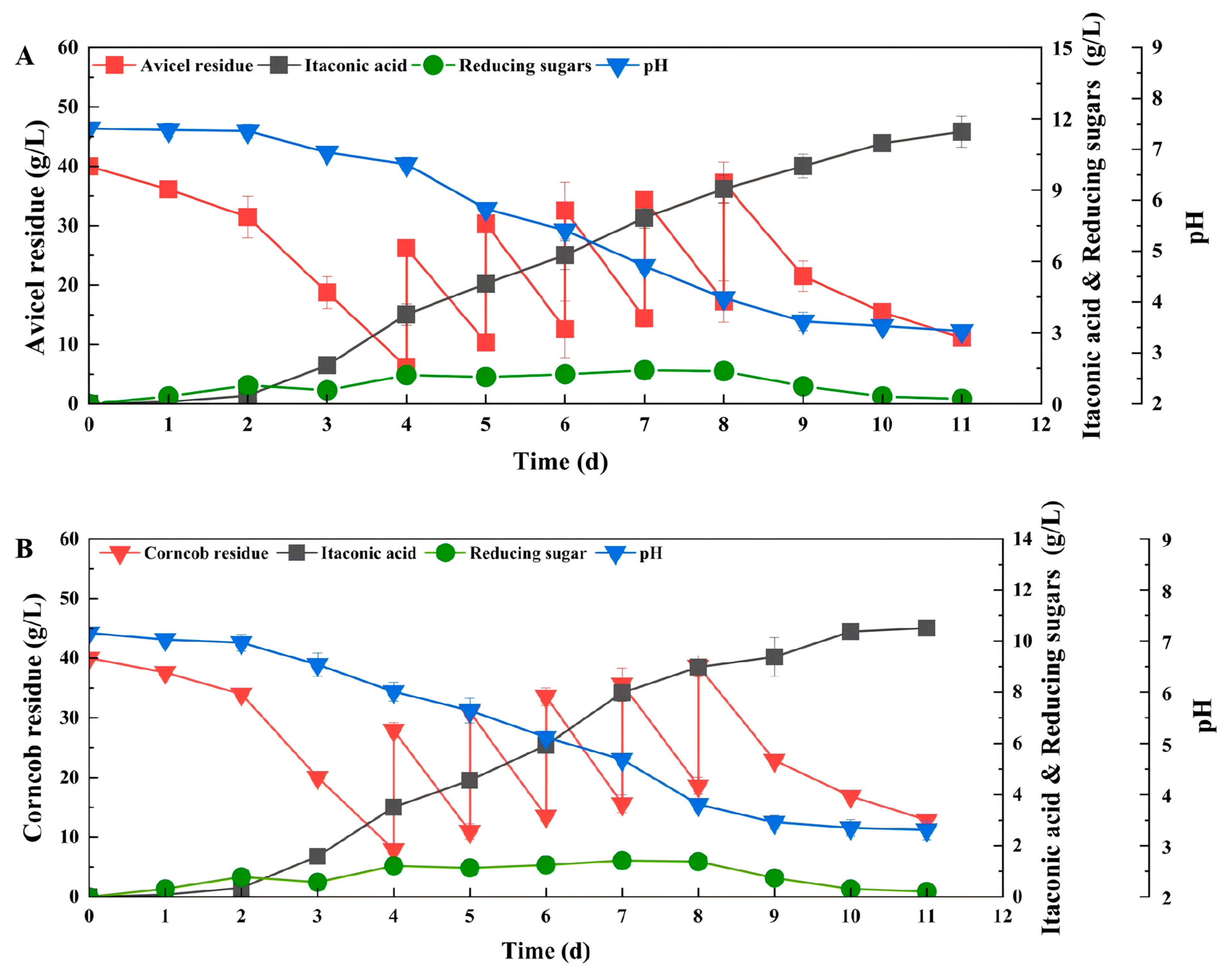 - Zhao, J.; Ma, C.; Mei, Y.; Han, J.; Zhao, C. Effect of itaconic acid production on Neurospora crassa in consolidated bioprocessing of cellulose. Microb. Cell Factories 2023, 22, 28. [Google Scholar] [CrossRef]