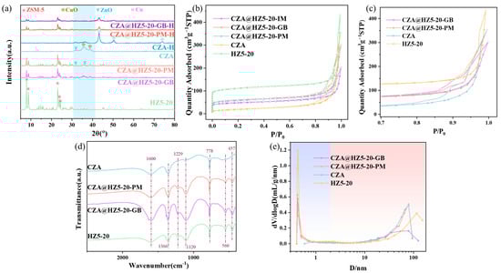 Structural characterization of catalysts (HZ5-20, CZA@HZ5-20-GB, CZA@HZ5-20-PM, CZA): (a) XRD pattern; (b) N2 adsorption–desorption isotherm; (c) local magnification of the N2 adsorption–desorption isotherm; (d) FTIR spectra; (e) pore size distribution.
