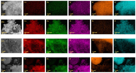 In order to observe the distribution of CZA catalyst and HZSM-5 zeolite more intuitively, we conducted SEM and elemental mapping on the catalysts of HZ5-20 (Figure 2a), CZA (Figure 2b), CZA@HZ5-20-GB (Figure 2c), and CZA@HZ5-20-PM (Figure 2d). It can be observed that HZSM-5 zeolite is composed of small particles agglomerated one after another. The CZA catalyst, on the other hand, is composed of small pieces interwoven together. By observing the elemental mapping of the catalysts CZA@HZ5-20-GB and CZA@HZ5-20-PM, it can be found that the distribution of Cu and Zn elements in the catalyst CZA@HZ5-20-PM is clearly distinct from that of Si element, but in the CZA@HZ5-20-GB catalyst, the distribution of the three elements intersects with each other.