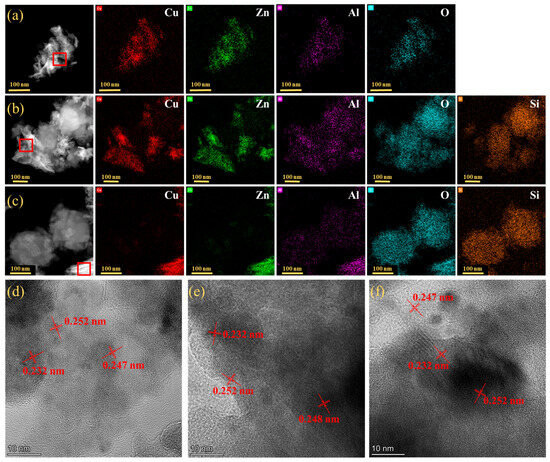Obviously, SEM can only observe the general morphology of the catalyst particles and cannot closely examine the contact between HZSM-5 zeolite and CZA catalyst within a single catalytic particle. For this purpose, we conducted TEM tests on the catalysts and carried out mapping and lattice analysis. The results are shown in Figure 3. By magnifying the CZA catalyst after dispersion treatment (Figure 3a), it can be observed that the CZA catalyst has no regular morphology and the elements are evenly dispersed. Lattice analysis (Figure 3d–f) of the catalyst shows that there are obvious crystal planes of CuO (1,1,1) (d = 0.232 nm), CuO (1,1,−1) (d = 0.252 nm), and ZnO (1,0,1) (d = 0.248 nm) in the catalyst. The catalyst CZA@HZ5-20-PM contains two morphologies: particles of about 100~200 nm and an irregular structure (Figure 3c). Combined with the results of the mapping, it can be found that the regular particles are HZSM-5 zeolite, and the substances with irregular structures are CZA catalysts. The two had almost no contact. From the TEM image of the catalyst CZA@HZ5-20-GB (Figure 3b), it can be clearly observed that the grinding process inserted the CZA catalyst into the middle of the HZSM-5 zeolite particles. Based on the characterization results of BET and pore size analysis, the formation of an approximately 100 nm pore size in HZ5-20 zeolite is attributed to the voids between zeolite particles rather than the internal channels of the zeolite. Grinding treatment causes CZA to occupy part of the voids of zeolite particles, which also explains why the pore volume of the CZA@HZ5-20-GB catalyst is much smaller than that of the CZA@HZ5-20-PM catalyst in the range of 30 to 100 nm.