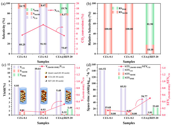 Performance of catalysts CZA-0.1, CZA-0.2, CZA@HZ5-20 in CO2 hydrogenation (250 °C, 3 MPa, 10 mL/min): (a) CO2 conversion of catalysts and selectivity of different products; (b) relative selectivity of products without CO; (c) the yield of the different catalytic products and the ratio of the yield of the target products (products without CO, Y(MeOH+DME+CH4+C2H6)) to the yield of the by-product (CO, YCO); (d) the space–time yield of different catalytic products and the ratio of the space–time yield of the target products (products without CO, STY(MeOH+DME+CH4+C2H6)) to the space–time yield of the by-product (CO, STYCO). The red arrow indicates that the value of the red line corresponds to the red coordinate axis on the right.
