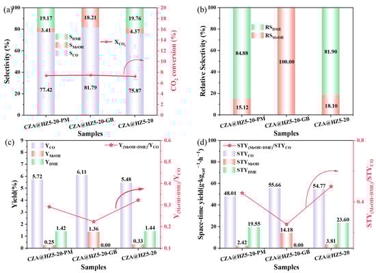 Performance of catalysts CZA@HZ5-20, CZA@HZ5-20-GB, CZA@HZ5-20-PM in CO2 hydrogenation (250 °C, 3 MPa, 10 mL/min): (a) CO2 conversion of catalysts and selectivity of different products; (b) relative selectivity of products without CO; (c) the yield of the different catalytic products; (d) the space–time yield of different catalytic products. The red arrow indicates that the value of the red line corresponds to the red coordinate axis on the right.