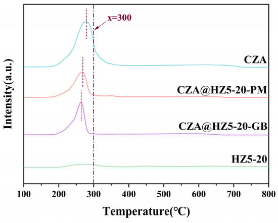 The reducibility of the catalyst, as an important parameter of the catalyst characteristics, was first tested by the H2-TPR method. Figure 7 shows that the peaks of H2 consumption for each catalyst are 263.4 °C (CZA@HZ5-20-GB), 267.9 °C (CZA@HZ5-20-PM), and 277.9 °C (CZA) respectively. The H2 consumed by the catalyst is mainly used to reduce CuO to Cu+ and further to Cu0 [41]. When CuO combines with ZnO and Al2O3, the H2 reduction of the catalyst will shift towards the direction of higher temperature [42]. The H2 consumption peaks of the catalysts CZA@HZ5-20-GB and CZA@HZ5-20-PM are close, mainly because the content and state of CZA are the same in both. The area of the H2 consumption peak of the CZA catalyst is much larger than that of other catalysts because the test mass of CZA is twice the CZA content in other catalysts. As a result, the peak value of the H2 consumption of the CZA catalyst shifts towards high temperatures, and the complete reduction temperature also increases.