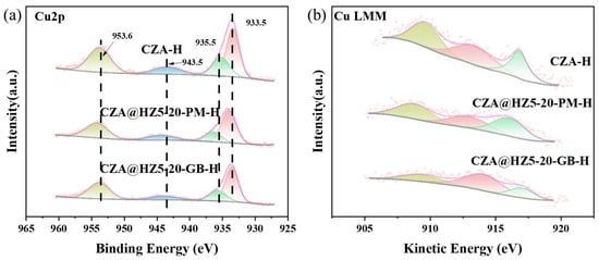 XPS test analysis was conducted on the reduced catalysts, with the main purpose of understanding the valence state of Cu element and the framework structure of zeolite. Figure 8a shows the fine spectrum of Cu, the main active component in the catalyst. The Cu2p1/2 peak at the binding energy of ~953.6 eV and the Cu2p3/2 peak at the binding energy of ~933.5 eV exist in all catalysts [43]. Through the fitting analysis of the Cu2p3/2 peak of the catalyst, this peak can be further divided into two main peaks: ~935.5 eV ascribed to Cu2+ species and ~933.5 eV ascribed to Cu+ and Cu0 species [44]. In addition, the peak at the binding energy of ~943.5 eV is the satellite peak and is regarded as Cu2+ [43]. It can be observed that the area of the Cu2+ peak of CZA@HZ5-20-GB catalyst is the smallest, indicating that the proportion of reduced Cu in the sample is the highest. Combined with the previous H2-TPR and TEM tests we conducted on the catalysts, this point has also been confirmed. To further understand the valence state of the reduced Cu species, we tested the Auger spectra of Cu (Figure 8b). Through the fitting analysis of the Cu LMM spectrum, each catalyst can be fitted into three peaks: the peak of kinetic energy at ~909 eV is considered to represent the transition state Cuδ+, the peak of kinetic energy at ~913 eV is considered to represent Cu+, and the peak of kinetic energy at ~917 eV is considered to represent Cu0 [44]. By comparison, it was found that the proportion of Cu+ was the highest and the proportion of Cu0 was the lowest in the CZA@HZ5-20-GB catalyst treated by grinding. This might be due to the grinding causing some of the CZA catalyst to combine with the HZSM-5 zeolite framework, where Cu2+ cannot be reduced to Cu0 but can only be reduced to Cu+.