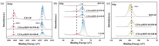XPS results: (a) Zn2p fine spectra of catalysts; (b) Al2p fine spectra of catalysts; (c) Si2p fine spectra of catalysts.