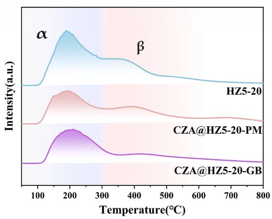 The distribution of acidic sites of the catalyst was tested by NH3-TPD (Figure 10). The number and distribution of acidic sites are listed in Table 4. It is well known that there are usually two types of acidic sites in HZSM-5 zeolite, namely weak acid sites and the strong acid sites [12]. Apparently, the distribution of weak acid sites and strong acid sites in CZA@HZ5-20-PM catalyst was almost the same as that in HZ5-20 catalyst, indicating that powder mixing treatment had no effect on the acidic sites of the catalyst. The content of weakly acidic sites in the grinding-treated catalyst CZA@HZ5-20-GB changed little, but the number of strongly acidic sites decreased significantly. Combining the previous BET characterization results and TEM test results, the grinding method led to the interpenetration of CZA particles and HZSM-5 particles, reducing the mesoporous pores in the catalyst. Studies show that reducible oxides such as ZnO and In2O3 are partially reduced to monovalent substances like In+ or [ZnOH]+ in the reaction atmosphere. These substances can easily migrate to the zeolite and irreversibly neutralize the Bronsted acid site on the closely contacting bifunctional catalyst [49]. Similarly, in this study, the catalyst CZA@HZ5-20-GB caused the strong acidic sites in the zeolite to be occupied by CuO due to the close contact space provided by the grinding treatment. The significant reduction and inactivation of strong acid sites directly resulted in the absence of DME in the product of CZA@HZ5-20-GB catalyst.