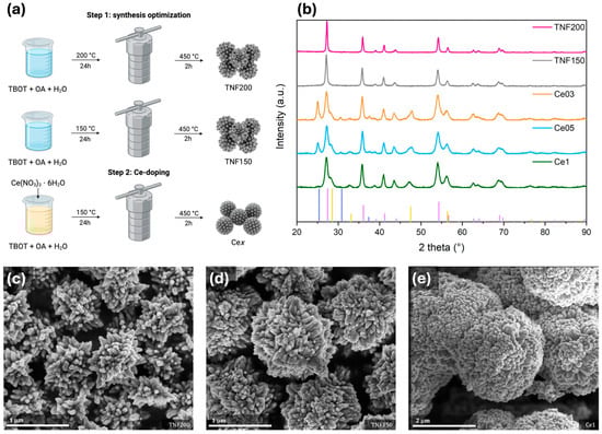Hierarchical submicrometric bare and Ce-doped TiO2 nanoflowers were obtained using a hydrothermal approach (Figure 1a). To find the optimal Ce content, three different concentrations were chosen: 0.3, 0.5, and 1.0 at% Ce in TiO2. The samples were identified as TNFt for bare TiO2 nanoflowers, where t stands for the reaction temperature (200 and 150 °C), and Cex for Ce-doped TNF, where x stands for the Ce content in at%.