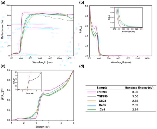 The effect of Ce doping on the optical and electronic properties of TNF has been studied by diffuse reflectance UV-visible-near-infrared spectroscopy (DRUV-Vis-NIR). The reflectance spectra of all samples, shown in Figure 2a, present the main absorption feature of TiO2 optical bandgap (lying at ~3.1 eV), which induces a strong absorption edge at about 390 nm, corresponding to the transition O2− (2p) → Ti4+ (3d). For all Ce-doped samples, a clear red-shift towards higher wavelengths of the main band can be observed, compared to bare TNF (Figure 2b). Ce doping allows higher absorbance in the 390–490 nm region, compared to undoped samples. Moreover, increased oxygen mobility, promoted by the Ce3+/Ce4+ redox couple, can contribute to narrowing the band gap of bare TiO2. It can also be noticed that the onset of absorption in doped samples is localized at higher wavelengths (~500 nm). This can be induced by the presence of additional localized states within the bandgap structure of TiO2 (for instance, Ce 4f states below TiO2 CB), which leads to an overall bandgap energy reduction (Figure 2c,d) [].