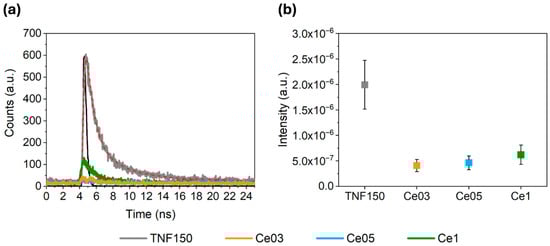 (a) TCSPC decays of bare and Ce-doped TNF150 evaluated at 450 nm (maximum wavelength of emission spectra), excited at 375 nm with a ps-pulsed laser (PicoQuant, Berlin, Germany) using a cut-off filter at 430 nm (430 LP). The corresponding instrument response function (IRF, black curve) and fittings (dashed red lines) for TNF150 and Ce1 are also reported. (b) Intensities of the bare and Ce-doped TNF calculated as absolute area of the ns-decay, including bar errors.